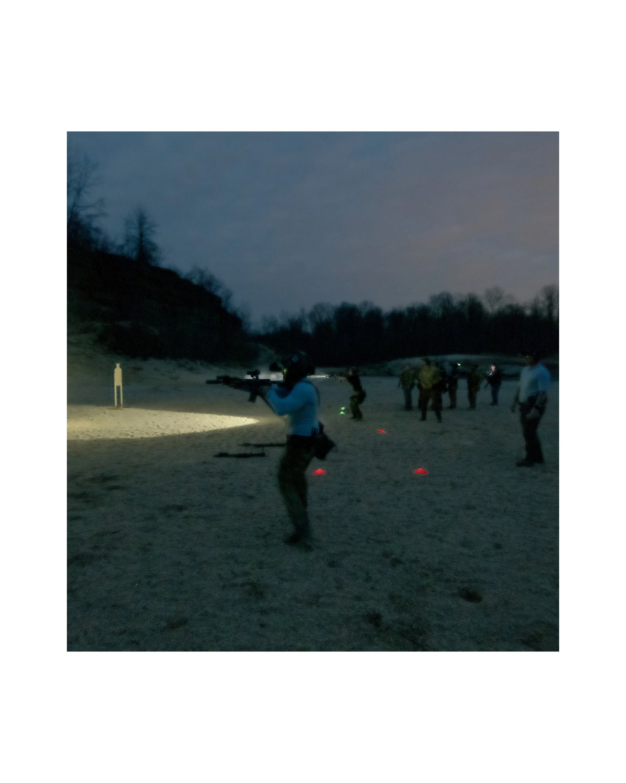 Group of people participating in a nighttime shooting range, with some aiming rifles and others observing, illuminated by artificial lights on a sandy outdoor field.
